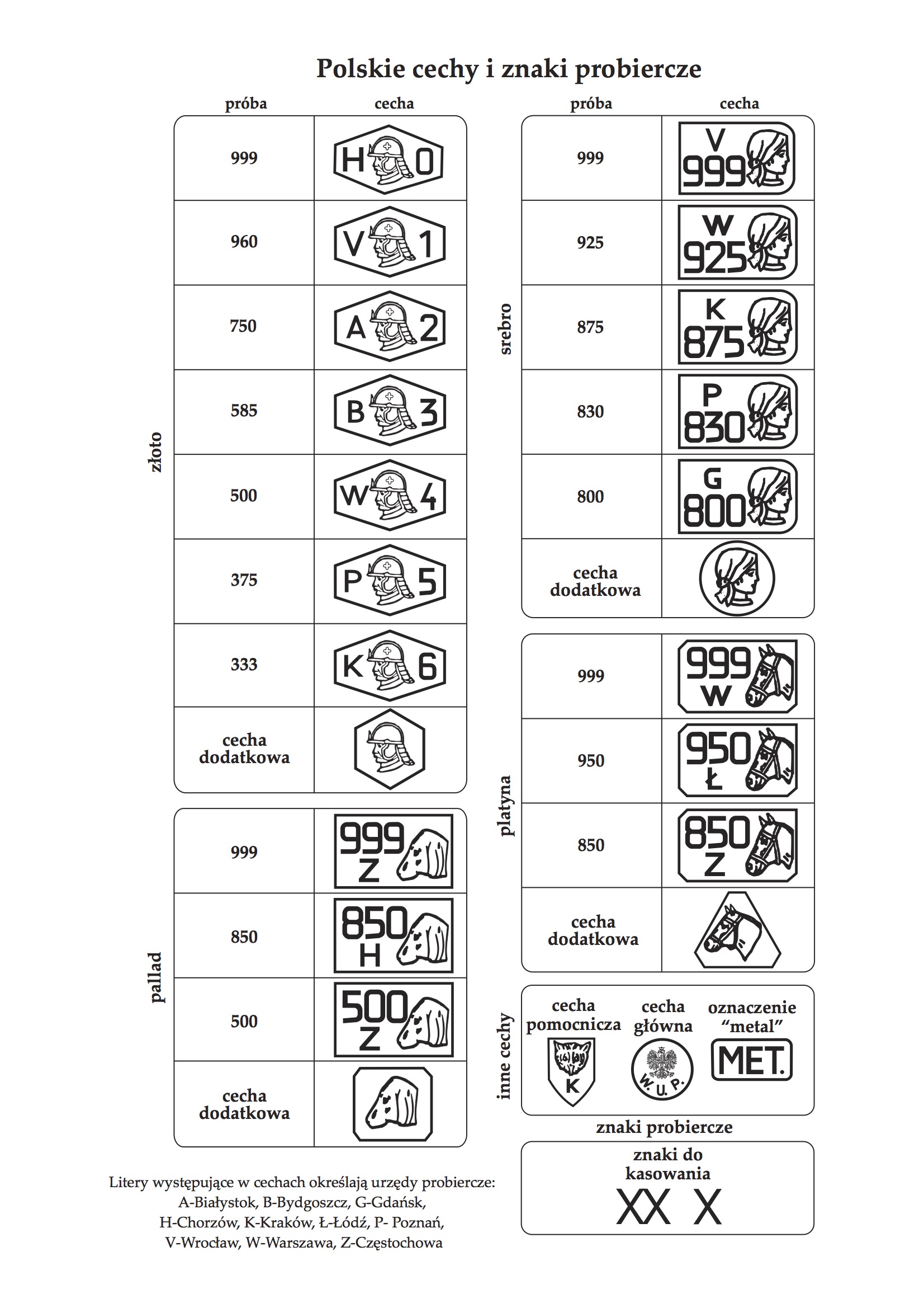 Każdy producent przed sprzedażą swoich wyrobów z metali szlachetnych, ma obowiązek oznaczyć produkt swoim znakiem imiennym. Następnie produkty te dostarczane są do Urzędu Probierczego. Zadaniem Urzędu jest przeprowadzenie badania na zawartość metali szlachetnych w dostarczonych wyrobach. Na podstawie tego badania Urząd określa próbę badanego produktu. Nabita próba jest dla Klienta najważniejszą gwarancją i potwierdzeniem na kupowaną biżuterię. Jeżeli dany produkt autentycznie posiada deklarowaną przez producenta próbę, to Urząd potwierdza to odpowiednią cechą, zgodnie z poniższą tabelą:
